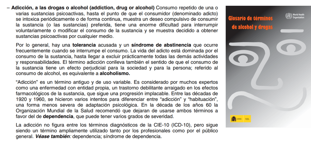 Ya en 1994, en el Glosario de términos de alcohol y drogas de la Organización Mundial de la Salud, afirma en su definición de adicción, a partir del tercer párrafo, el desdibujamiento de la palabra adicción ya que bien ha sido una muleta dónde hemos apoyado muchas situaciones: desde la menor gravedad adictiva hasta la mayor.