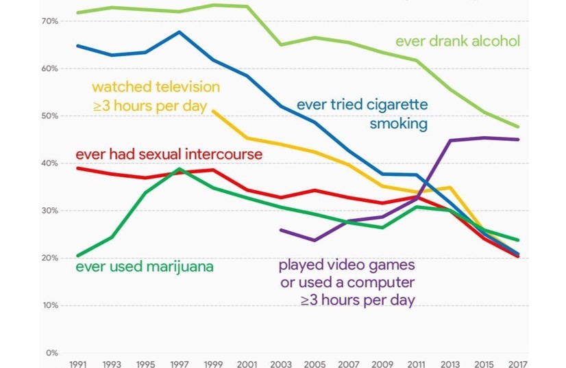 Actividades como consumir mariana, fumar tabaco, alcohol, tener la primera relación sexual o ver la tele. Encuesta llevada a acabo por el Centro para el Control y la Prevención de Enfermedades (CDC) de Estados Unidos en 2017.